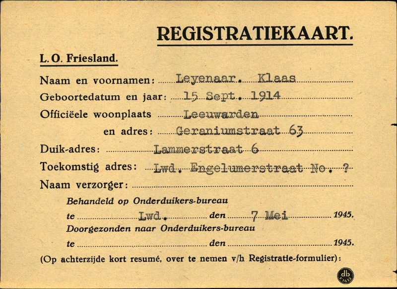 Duikadres: Lammerstraat 6, - Oorspronkelijk adres: Geraniumstraat 63, Leeuwarden - Reden onderduik: anderszins - Overige opmerkingen: Achterkant bijzonderheden: Reden onderduiken is onbekend. - Achterkant beroep: Kantoorbediende