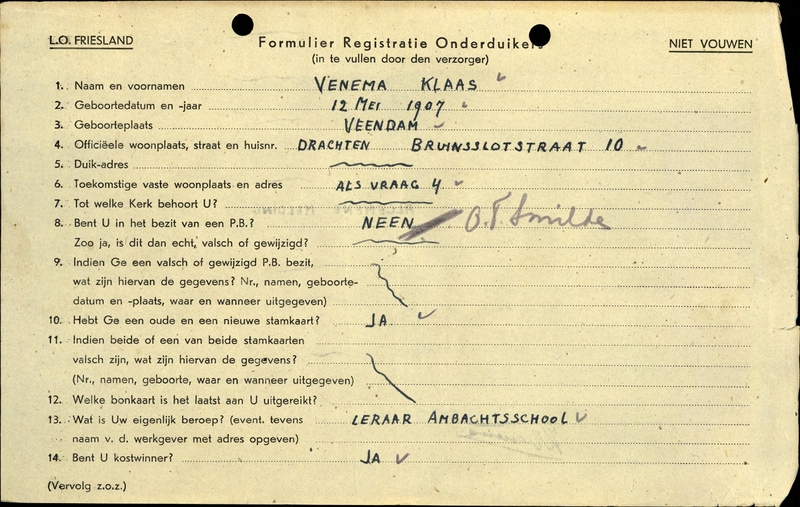 Duikadres: Diverse adressen, - Oorspronkelijk adres: Leeuwerikstraat 46, Leeuwarden - Overige opmerkingen: Achterkant bijzonderheden: Diverse onderduikadressen, naam verzorger onleesbaar