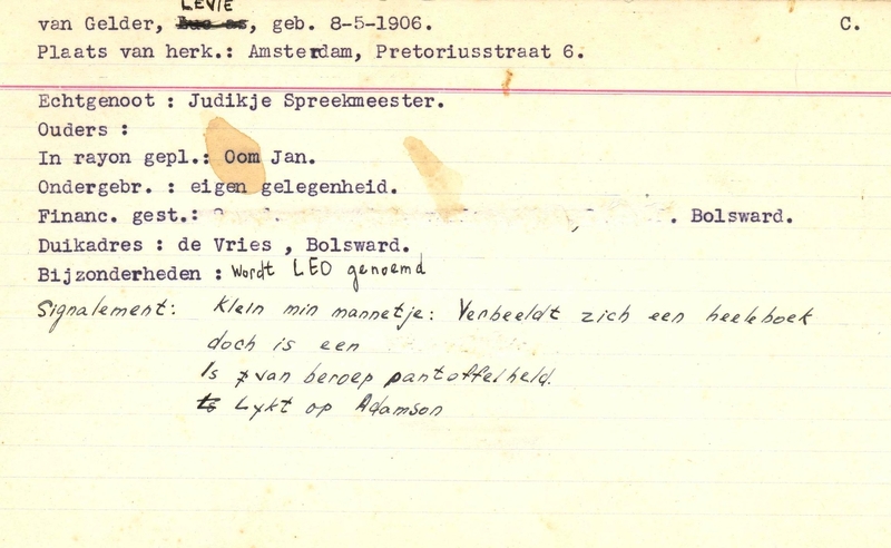 Duikadres: Bolsward - Oorspronkelijk adres: Pretoriusstraat 6, Amsterdam - Overige opmerkingen: Bijzonderheden: wordt LEO genoemd. Signalement: klein min mannetje: Verbeeld zich een heeleboek doch is een ,Is van beroep pantoffelheld - lijkt op Adamson