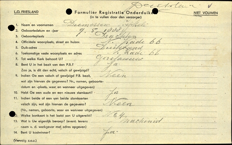 Duikadres: Duitsland - Oorspronkelijk adres: Noordkade 66, Drachten - Reden onderduik: arbeidsinzet - Overige opmerkingen: Bijzondere opmerkingen: Met potlood bijgeschreven in D. geweest
