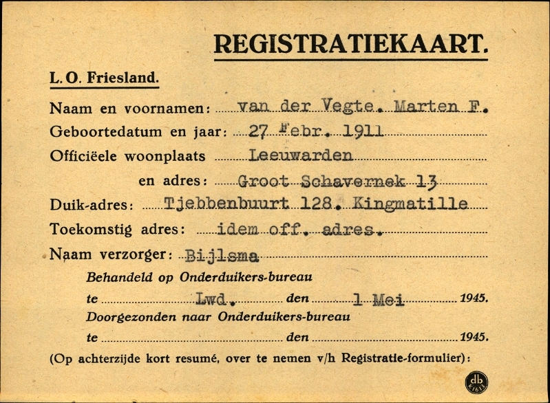Onderduikregistratie van Marten F. van der Vegte