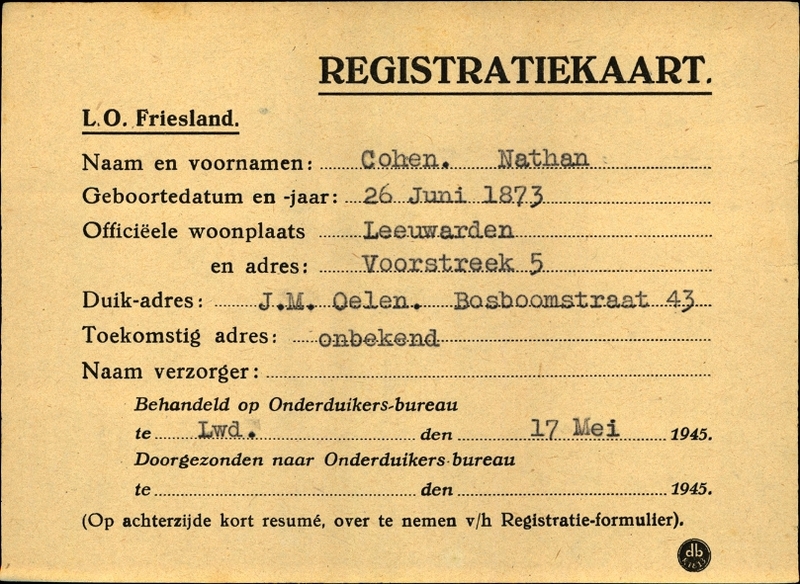 Duikadres: Bosboomstraat 43, Leeuwarden - Oorspronkelijk adres: Voorstreek 5, Leeuwarden - Reden onderduik: jodenvervolging - Overige opmerkingen: Achterkant bijzonderheden: Vermelding bij Duik-adres: J.M. Oelen - Achterkant beroep: winkelier