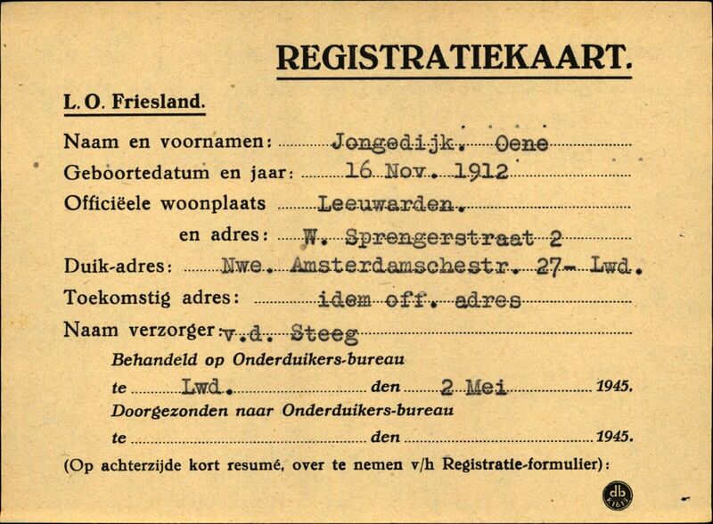 Duikadres: Nieuw Amsterdamstraat 27, Leeuwarden - Oorspronkelijk adres: Willem Sprengerstraat 2, Leeuwarden - Reden onderduik: anderszins - Overige opmerkingen: Achterkant bijzonderheden: Ondergedoken wegens weigering toe te treden tot de N.S.K.K. - P.B. afgen. door NSKK alsook nwe. stkrt. - Achterkant beroep: automonteur