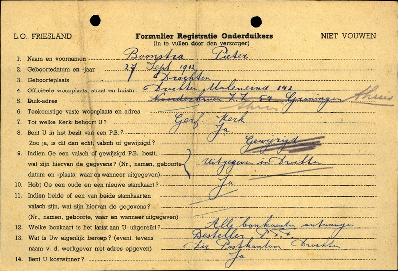 Duikadres: Moleneind 142, Drachten - Oorspronkelijk adres: Moleneind 142, Drachten - Reden onderduik: arbeidsinzet - Overige opmerkingen: Bijzondere opmerkingen: Onderduikadres in eerste instantie 'Groningen, Noorderhaven Z.Z. 54'. Is doorgestreept en vervangen door 'thuis'. - Financiële steun van O.G. ongeveer 6 weken en daarna kon ik mij zelf redden.