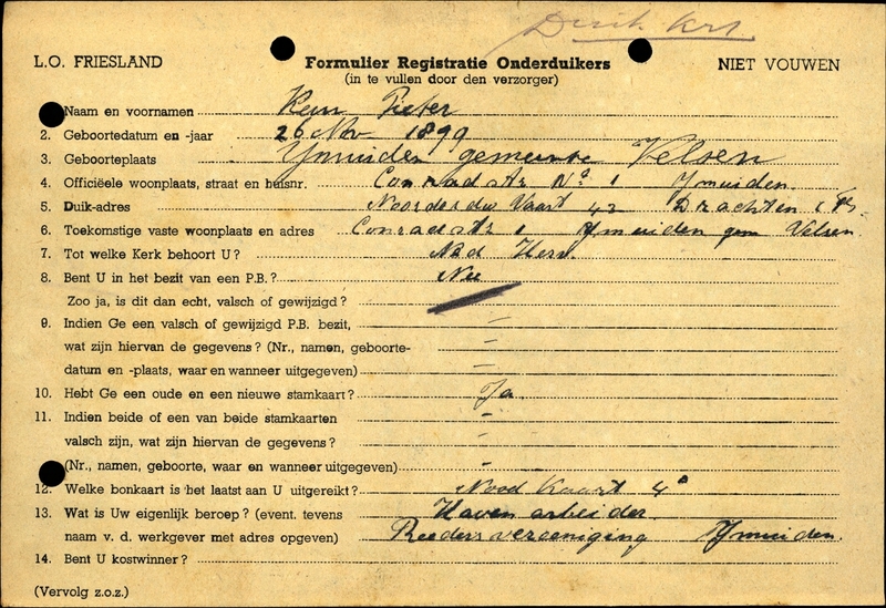 Duikadres: Noorderdwarsvaart 42, Drachten - Oorspronkelijk adres: Conradstraat 1, IJmuiden - Reden onderduik: arbeidsinzet - Overige opmerkingen: Bijzondere opmerkingen: reden onderduik: Om niet voor de mof te werken. - Beslag gelegd op uw bezittingen: Oja