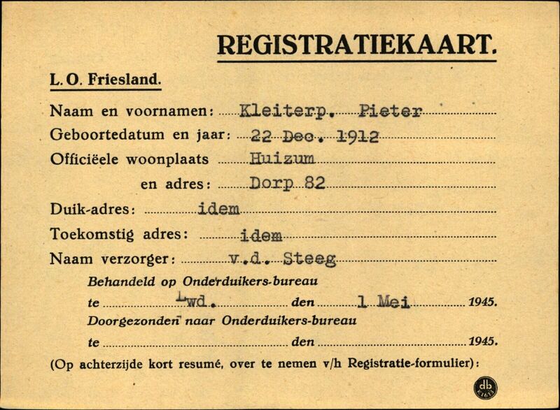 Duikadres: Dorp 82, Huizum - Oorspronkelijk adres: Dorp 82, Huizum - Reden onderduik: krijgsgevangene - Overige opmerkingen: Achterkant bijzonderheden: Reden onderduik: wegens krijgsgevangenschap en A.I. - Goede stkrt. - Achterkant beroep: aspirant-constructeur