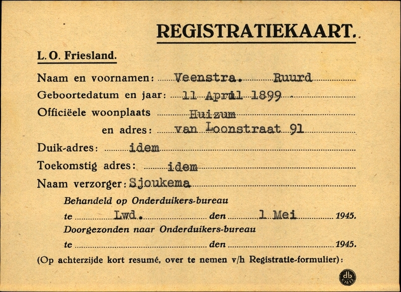Duikadres: Van Loonstraat 91, Huizum - Oorspronkelijk adres: Van Loonstraat 91, Huizum - Reden onderduik: arbeidsinzet - Overige opmerkingen: Achterkant beroep: koopman in manufacturen