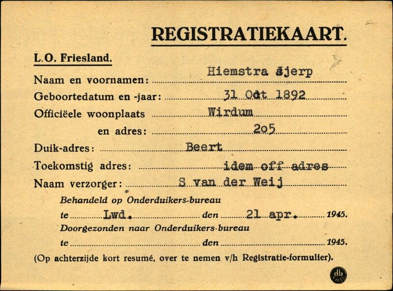 Duikadres: Beert - Oorspronkelijk adres: 205, Wirdum - Reden onderduik: staking - Overige opmerkingen: Achterkant bijzonderheden: Duik-adres: Beert. Plaatsnaam? Straatnaam? Er is een dorp Beert in Belgie - Achterkant naam werkgever: N.S.