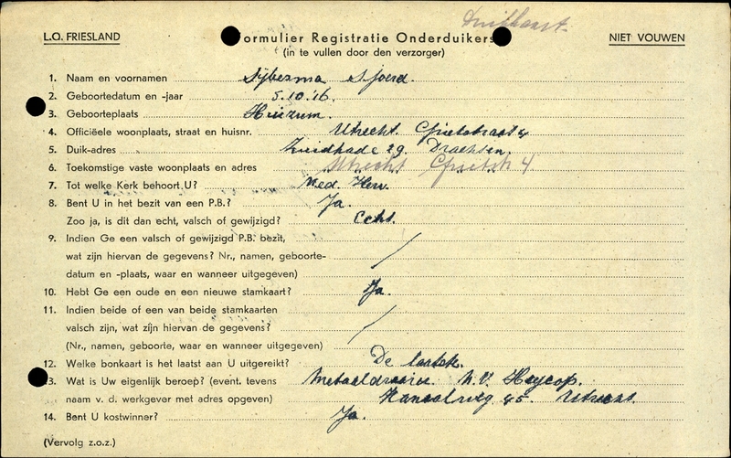 Duikadres: Zuidkade 29, Drachten - Oorspronkelijk adres: Grietstraat 4, Utrecht - Reden onderduik: arbeidsinzet