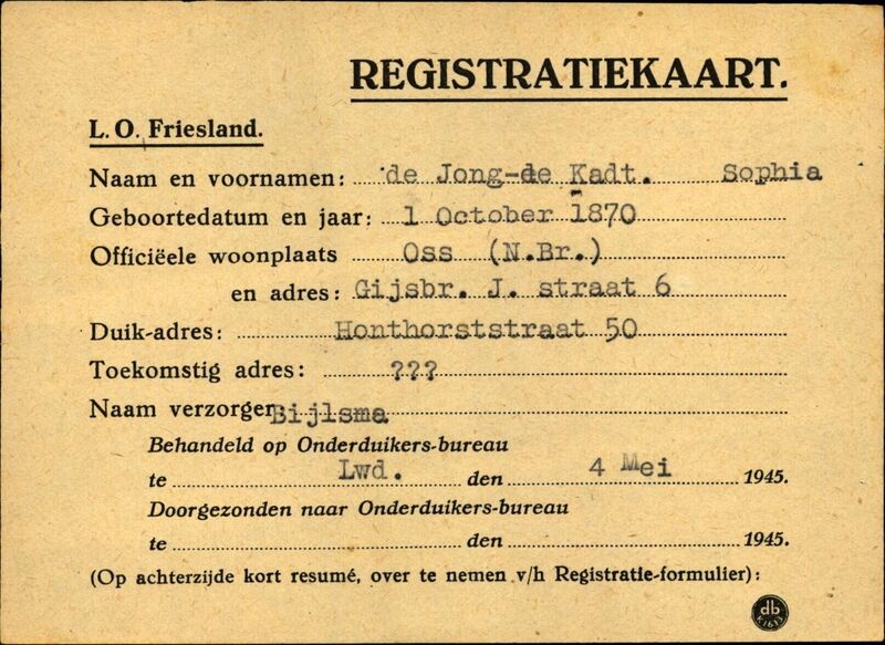 Duikadres: Honthorststraat 50, Leeuwarden - Oorspronkelijk adres: Gijsbr. J. straat 6, Oss - Reden onderduik: jodenvervolging - Overige opmerkingen: Achterkant bijzonderheden: Gehuwd met de Jong. - Geen volledige pap. - Achterkant beroep: - - Achterkant naam werkgever: -