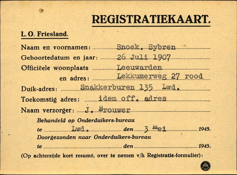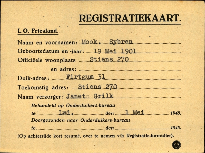 Duikadres: 31, Firdgum - Oorspronkelijk adres: 270, Stiens - Reden onderduik: staking - Overige opmerkingen: Achterkant bijzonderheden: Geen pap. - Toekomstig adres: Stiens 270 - - Behandeld op Onderduikers-bureau te Lwd. den 1 Mei 1945 - Achterkant beroep: werkzaam geweest bij Ned. Spoorw. - Achterkant naam werkgever: Ned. Spoorw.