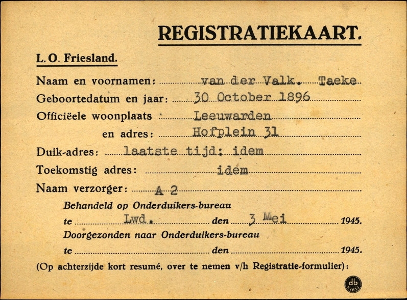 Duikadres: Hofplein 31, Leeuwarden - Oorspronkelijk adres: Hofplein 31, Leeuwarden - Reden onderduik: arbeidsinzet - Overige opmerkingen: Achterkant bijzonderheden: Eerst ondergedoken geweest wegens onderduiken van zijn zoon Klaas van der Valk (werkzaam op Secr. Gem. Gaasterland). Later ondergedoken wegens A.I. P.B. gewijzigd. - Achterkant beroep: Administrateur-zaakwaarnemer - Achterkant naam werkgever: -