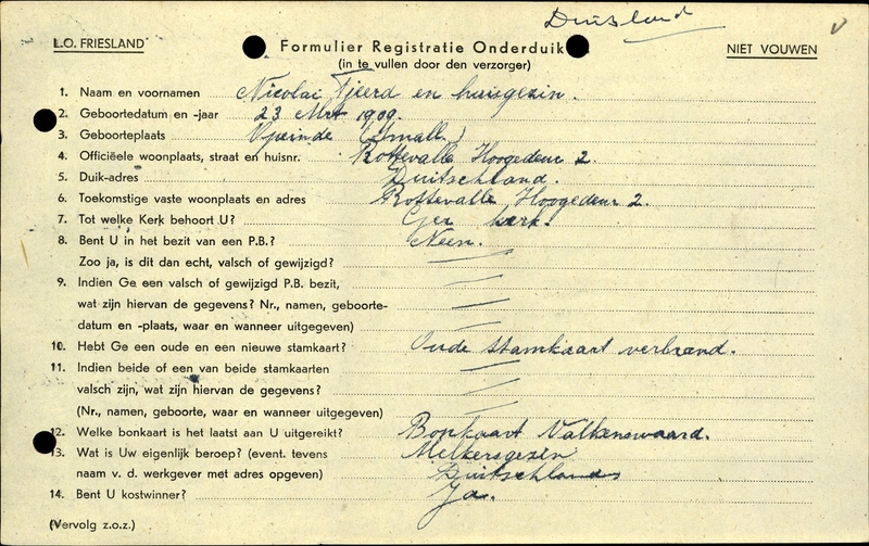 Duikadres: Duitsland - Oorspronkelijk adres: Hegedoar 2, Rottevalle - Reden onderduik: arbeidsinzet - Overige opmerkingen: Bijzondere opmerkingen: Vijand heeft beslag gelegd op de helft van bezittingen. Moeder van betreffende heeft geen woning.