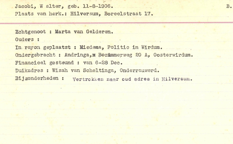 Duikadres: Rauwerd - Oorspronkelijk adres: Boreelstraat 17, Hilversum - Overige opmerkingen: Bijzonderheden: Ondergebracht: Andringa, Bozummerweg 20 A, Oosterwirdum? (Misschien Oosterwierum ?) - Financieel gesteund: van 6-28 dec. - Vertrokken naar oud adres in Hilversum