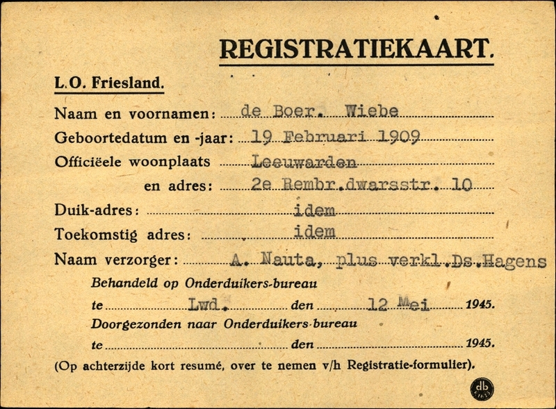Duikadres: 2e Rembrandtdwarsstraat 10, Leeuwarden - Oorspronkelijk adres: 2e Rembrandtdwarsstraat 10, Leeuwarden - Reden onderduik: arbeidsinzet - Overige opmerkingen: Achterkant bijzonderheden: Naam verzorger: A. Nauta, plus verkl. Ds. Hagens - Achterkant beroep: Chauffeur
