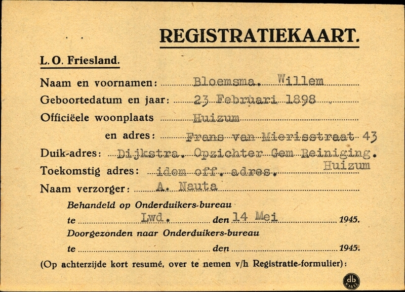 Duikadres: Huizum - Oorspronkelijk adres: Frans van Mierisstraat 43, Huizum - Reden onderduik: staking - Overige opmerkingen: Achterkant bijzonderheden: Spoorwegstaking. - Nwe. stkrt. valsch. - Ondergedoken bij Dijkstra, opzichter Gem. Reiniging. - Achterkant beroep: Adj. commies - Achterkant naam werkgever: N.S.