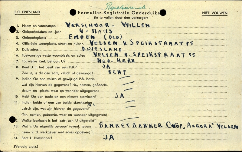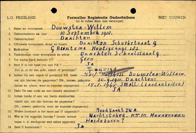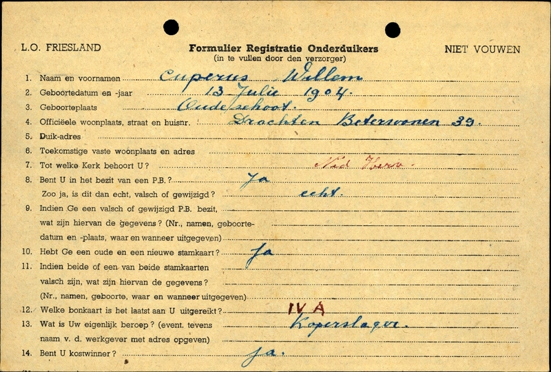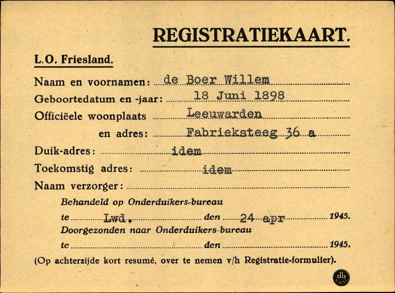Duikadres: Fabrieksteeg 36 a, Leeuwarden - Oorspronkelijk adres: Fabrieksteeg 36 a, Leeuwarden - Overige opmerkingen: Achterkant bijzonderheden: Ondergedoken vanwege werk in Drente. - Ondergedoken vanwege werk in Drente - Achterkant beroep: Houtstekknecht - Achterkant naam werkgever: -