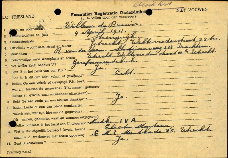 Duikadres: Stationsweg 233, Drachten - Oorspronkelijk adres: Weltevredenstraat 22bis, Utrecht - Reden onderduik: arbeidsinzet