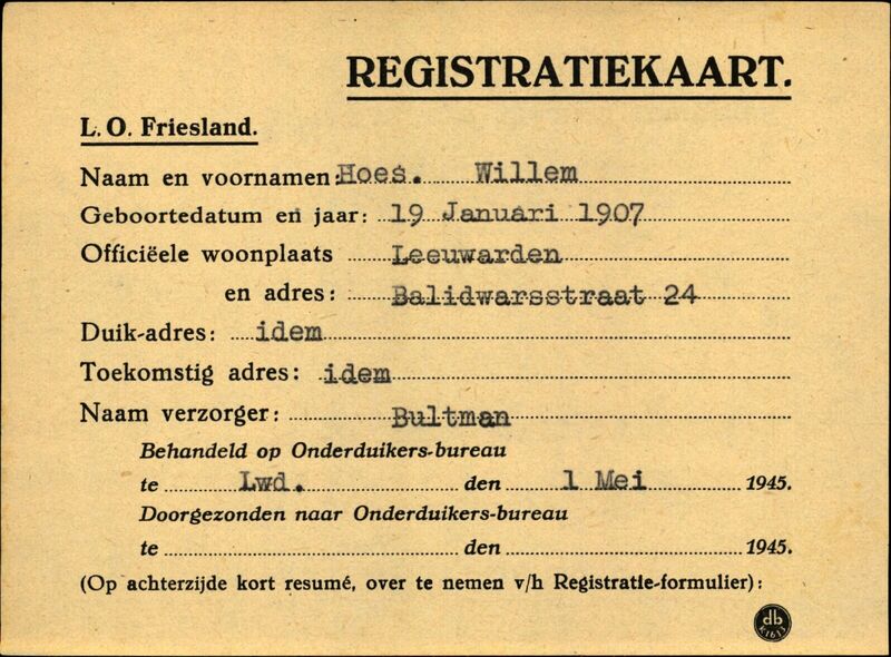 Duikadres: Balidwarsstraat 24, Leeuwarden - Oorspronkelijk adres: Balidwarsstraat 24, Leeuwarden - Reden onderduik: arbeidsinzet - Overige opmerkingen: Achterkant bijzonderheden: Werkzaam geweest als magazijnbediende. - Ondergedoken wegens A.I. - Gewijzigd P.B. geen stkrt. - Achterkant beroep: magazijnbediende