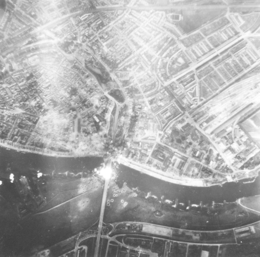 'The actual strike', voltreffers van geallieerde bommen midden op de Rijnbrug te Arnhem