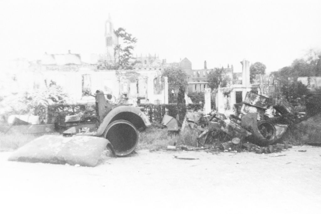 Utrechtseweg (Bovenover), Arnhem. Een Duitse mitrailleurpost op de helling van de stuwwal, ter hoogte van het St. Elisabeths Gasthuis. Op de achtergrond de Grote Eusebiuskerk.<br/>Het snelvuurwapen is een MG 151/15 (15 mm) op een affuit, en werd denkelijk gebruikt als een licht kaliber luchtdoelkanon