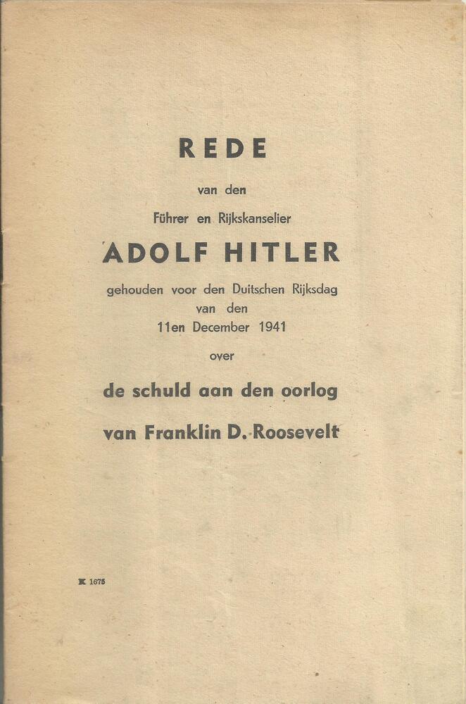Rede gehouden voor de Duitse Rijksdag op 11 december 1941 over de schuld aan de oorlog van Franklin D. Roosevelt. Archief 0581: Collectie Tweede Wereldoorlog > Collectie "Tweede Wereldoorlog" > Nationaal Socialistisch propagandaboekje getiteld: Rede van den Führer en Rijkskanselier Adolf Hitler; 1941