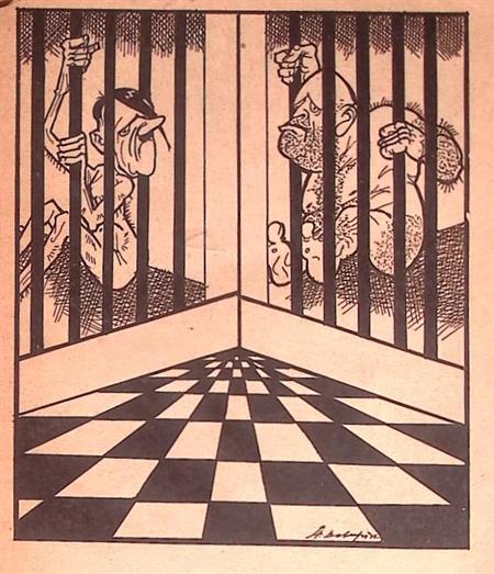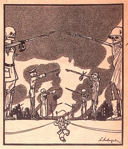 Verwerkt in de prent zijn Adolf Hitler, Franklin Delano Roosevelt, en Winston Churchill. Adolf Hitler was een Duitse politicus die van 1934 tot 1945 de rol van staatshoofd van Duitsland vervulde.Sein Kampf - Woede.Prent afkomstig uit spotprent boek Sein Kampf. Gedrukt in 1944 in Jeruzalem, gemaakt door Kunstenaar Stanislaw Dobrzynski. Bijzonder boek met een lage opgave, uitgegeven terwijl de oorlog nog in volle gang was.De prent heeft een afmeting van ca. 15 bij 20 centimeter.
