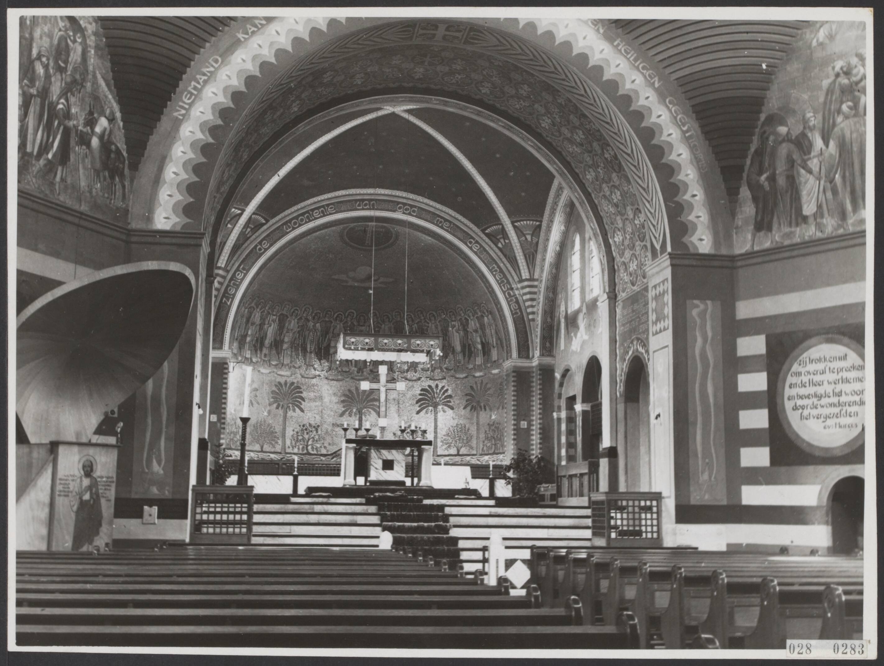 Het altaar en priesterkoor in het interieur van de CenakelKerk met een mozaïek (Het Nieuwe Paradijs) van Piet Gerrits uit 1921 en muurschilderingen van Piet Gerrits uit 1928-1930