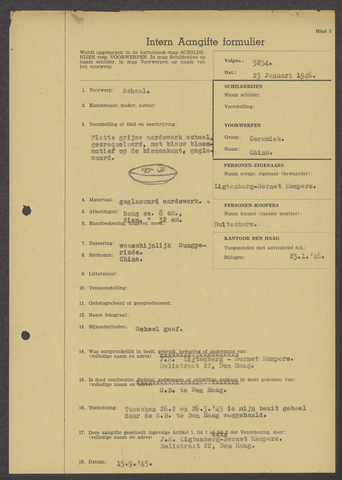 Aangifteformulier - Aangiftedatum: 1946-11-25 - Aangiftenaam: Stichting Nederlandsch Kunstbezit - Aangiftenummer: 16708 - Aangifteplaats: Amsterdam - Status: vrijwillige verkoop