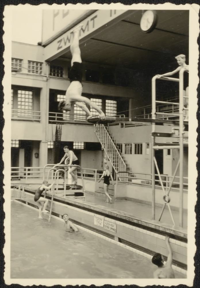 Zwemmers in het water en langs de kant in het Sportfondsenbad te Arnhem
