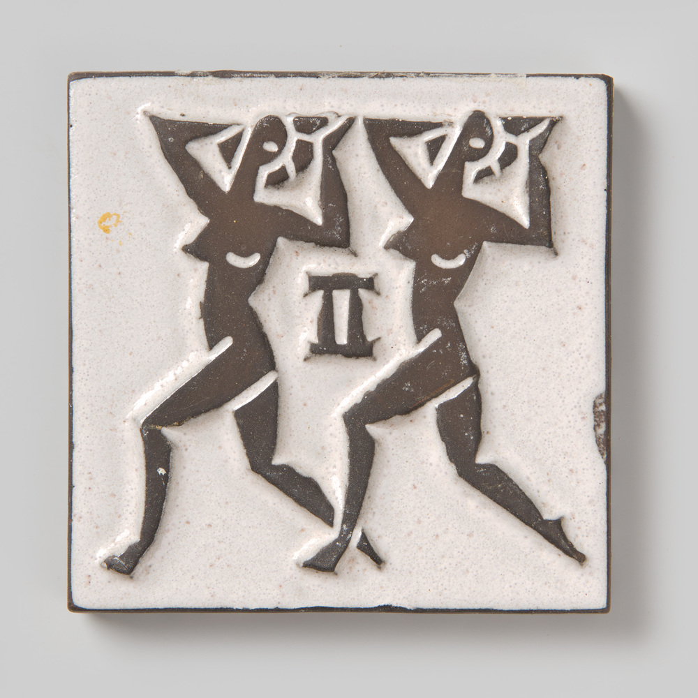 Tegel in chanoir-techniek, met voorstelling: sterrenbeeld Ram, vervaardigd in Utrecht door Westraven naar een ontwerp van Koos van der Sluys, ca. 1945-1960