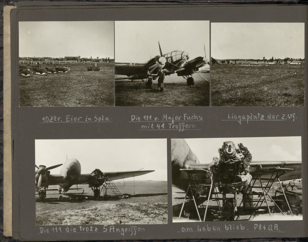 Boven: wrakken van een Junkers Ju 52, Messerschmitt Bf 110 en Dornier Do 17E. Onder: noodlanding Messerschmitt Bf 109 met dodelijk schot door stoel.Locatie is mogelijk Noorwegen Stavanger-Sola.