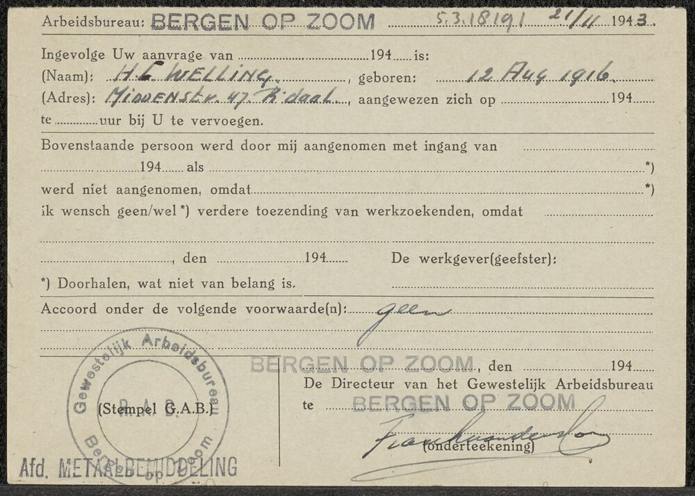 Briefkaart van Gewestelijk Arbeidsbureau Bergen op Zoom dat H.C. Welling zich bij Philips moet vervoegen, d.d. 21/11/943