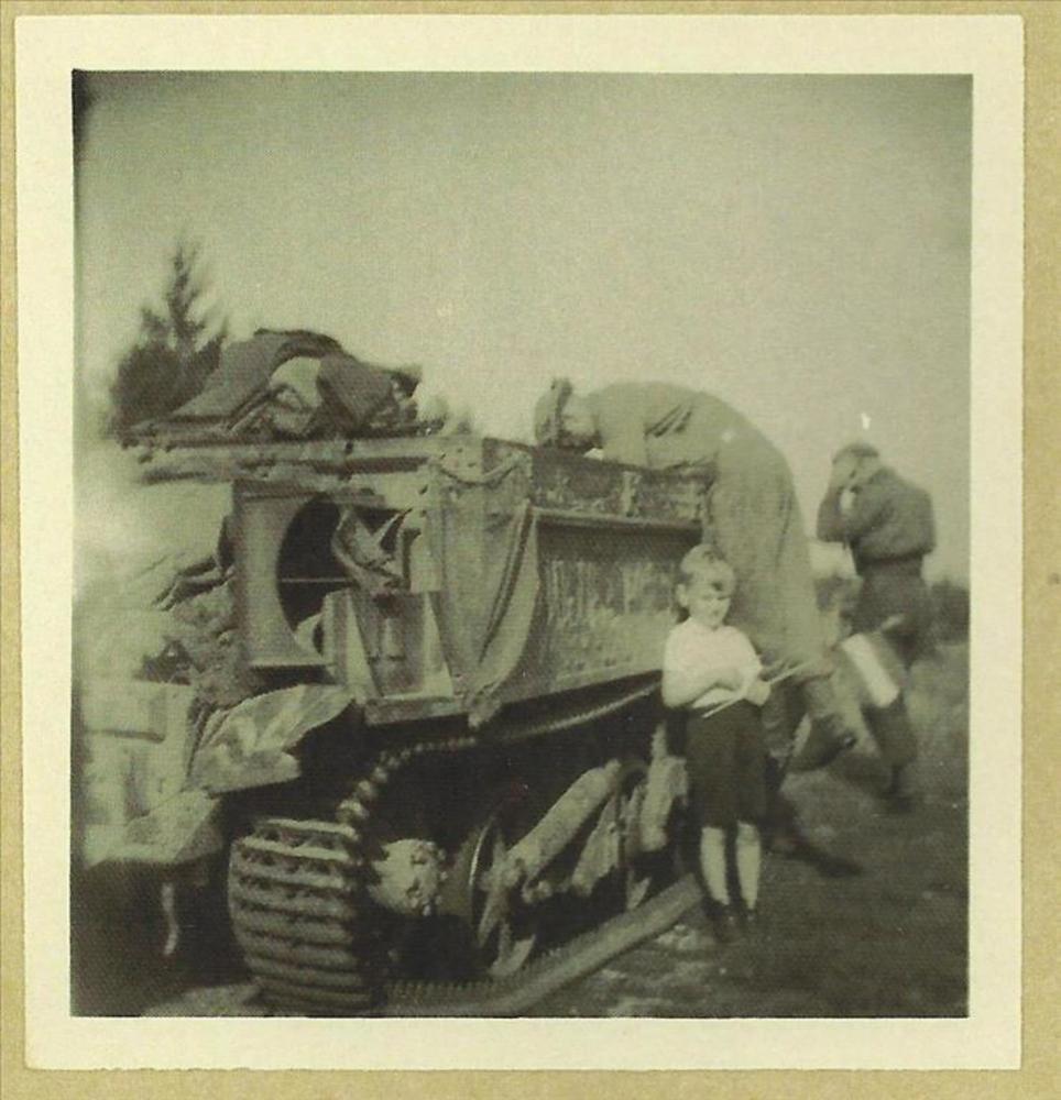 Foto lachend meisje voor geallieerde tank, grenadier Guards bij bevrijding Nijmegen, Sionsweg. 22 september 1944.