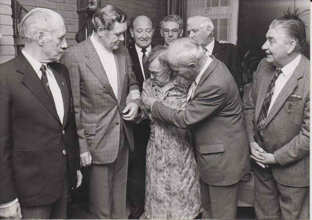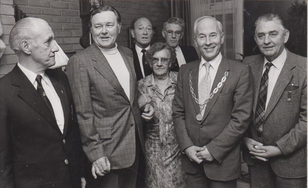 Foto van Theodora Bosch temidden van gasten bij gelegenheid van het uitreiken van een onderscheiding. Rechts Dhr. van Gils, burgemeester Gem. Groesbeek