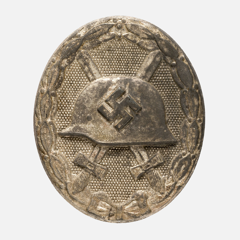 Een Duits model gewondendraaginsigne (Verwundetenabzeichen). Het ovalen embleem toont een gevechtshelm met swastika op twee gekruiste zwaarden. Hieromheen een krans van twee samengebonden takken.