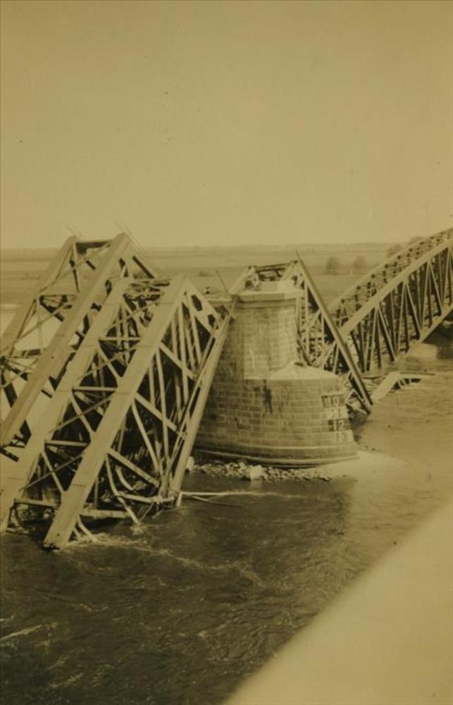 Foto van opgeblazen brug, ongeïdentificeerd met ervoor een drijvende bok met kraan. Opschrift: "Werf Conrau Haarlem"