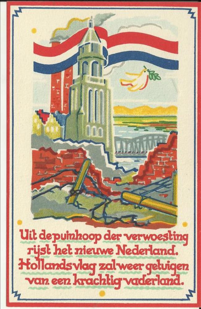 Uit de puinhoop der verwoesting rijst het nieuwe Nederland. Hollandsvlag zal weer getuigen van een krachtig vaderland. . No 4 der serie van 5 briefkaarten "Voor Vrijheid en Recht" Uitgegeven in Mei 1945 te Baarn door G.J.Wessels (Ontwerp Stella den Boer)