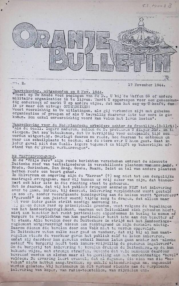 Radio Oranje zaterdag 18 november 1944. 'Het geheele westelijke front in beweging. Het zwaarste bombardement sedert den oorlog.' Regeringswaarschuwing voor razzia's in Amsterdam en Delft 'De galg in Vught' 'In Joegoslavië' 'De slavenjacht' 'Op Leyte' 'In Italië'