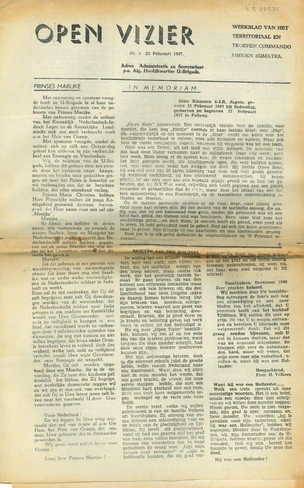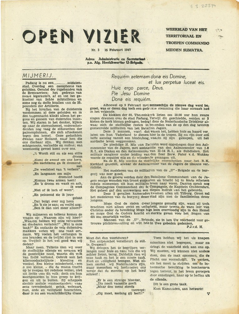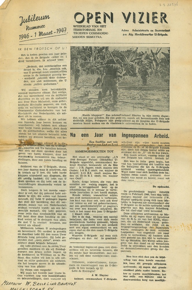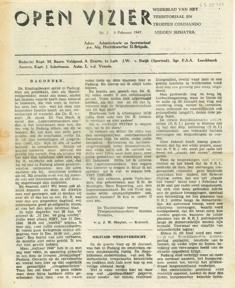 Open Vizier. Weekblad van het Terr. en Troepen Commando Midden Sumatra, No. 1, februari 1947 Bijlage van de Padang-bode voor militairen in het territorium Midden-Sumatra.Uitgave van de Dienst Legercontacten U-Brigade Padang.