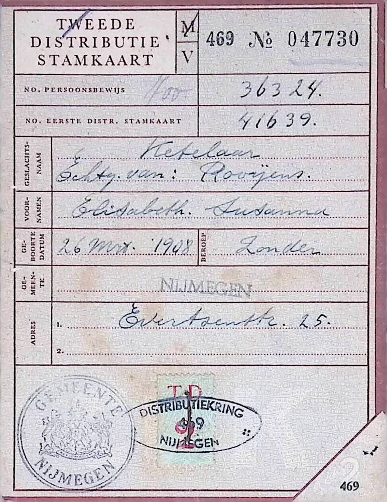 Distributiestamkaart op naam van Ketelaar E.S.Geboren op 26 maart 1908 te Workum.Afgegeven op 15 oktober 1939 te Nijmegen.no 41639.Documenten afkomstig uit het familie-archief van C.J. Rooijens.
