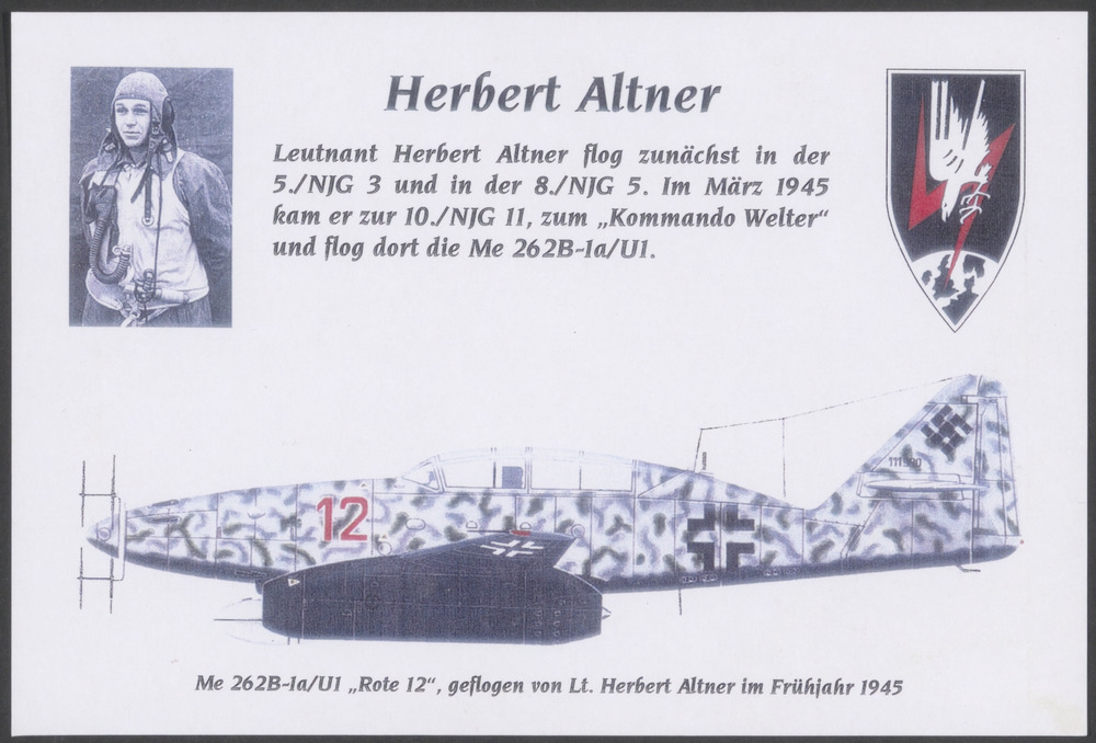 Oorkonde met foto, embleem en afbeelding Do 217 met de tekst:Herbert AltnerHerbert Altner flog im Frühjahr 1943 bei der 5./NJG 3 dieDo 217N, später die BF110G-4. Mit einer Maschine diesesTyps erzielte er am 17. Juli 1944 bei der 8./NJG 5 innerhalbvon 33 Minuten 5 Luftsiege über britische Lancaster-Bomber. Ab August 1944 flog Herbert Altner die Ju 88G