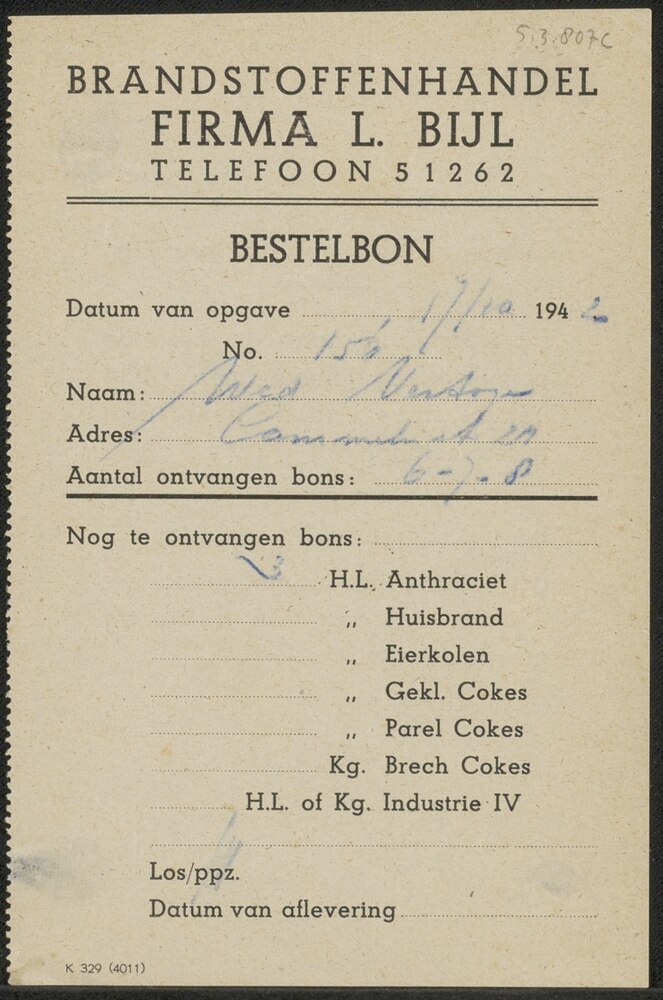 Bestelbon van wed. Vertogen bij Fa. L. Bijl