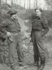 Foto van twee Canadese officieren (een eerste luitenant en een majoor van het Régiment de la Chaudiere voor bomenrij en op de achtergrond wat bakstenen. Markering oorspronkelijke envelop: "Foto's Dion-Zwaaf Canada, negatieven zijn bij G. Thuring".