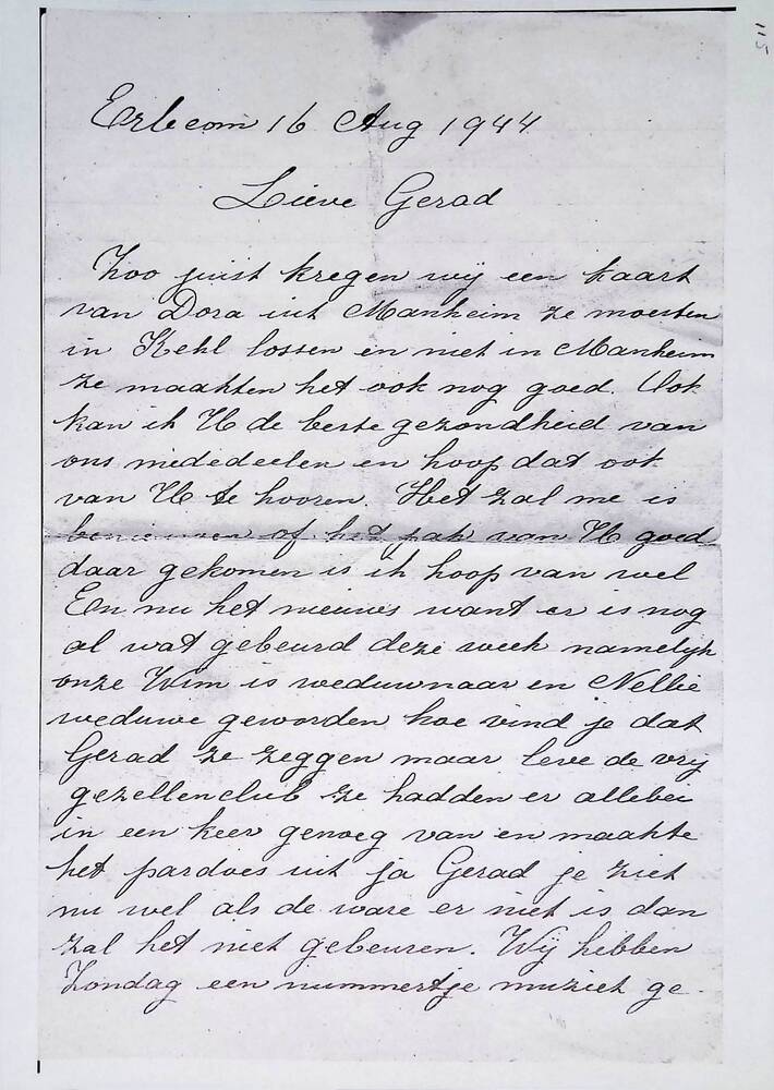 Brief in enveloppe. 26 augustus 1944. Aan den heer Gerardus Christiaan Janssen. Per adres Machine Fabriek Boecher und Volkenborn Hohenlimburg in Westfalen.Verzameling brieven voor Gerard Janssen die tewerkgesteld was in Duitsland. Per adres Dicke Eichen Hohenlimburg in Westfalen.Een korte samenvatting van deze brief.Een brief van de broer van Gerard, Wim.Beste broer Gerard,Het gaat hier nog alles zeer zuiver. We zijn allemaal nog kerngezond. Vanmorgen kregen we een kaart en een brief tegelijkertijd. Je schreef dat het daar erg warm was. Hier ook, maar we hebben de Waal nog. Die is bijna leeg. Je kunt er met een stok overheen springen. Ik ben naar de dokter geweest. Ik had last van de rug. Ik heb wat poeders gekregen. En wat rust natuurlijk. Het niks doen hangt mij nu al de keel uit. Van Dora en Piet hebben nog steeds niets vernomen. Met die Jos maken ze van alles mee. Hij zal nog wel eens een keer vloeken. Van de visserij is het geen rijk worden. Het water is ook erg laag. Alles ligt hier droog. De fam. Lentjes is vanmorgen weer voorbij gekomen. Herman heeft nog steeds een oogje op onze Nelly. Ik heb weer een ander. Maria de Haan uit Kekerdom. Je denkt natuurlijk dat is vlug. Ik gaf geen zak meer om Paula. Ik heb al vaker tegen je gezegd, die deugen niet Paula niet en Stientje ook niet. Nu ben ik weer in Kekerdom gekomen bij Marie. Ze is 21 jaar en heeft veel met me op. Als je weer naar huis komt dan kunnen we alles weer eens goed bespreken. Het is een rare sport die liefde. Herman Peter is ook weer thuis. Hij heeft verlof bij de Arbeidsdienst. Toon Sanders zit ook nog steeds thuis. Hoor je van Mahler nog wel eens wat. We moeten maar feesten als weer bij elkaar zijn met de oude ploeg.
