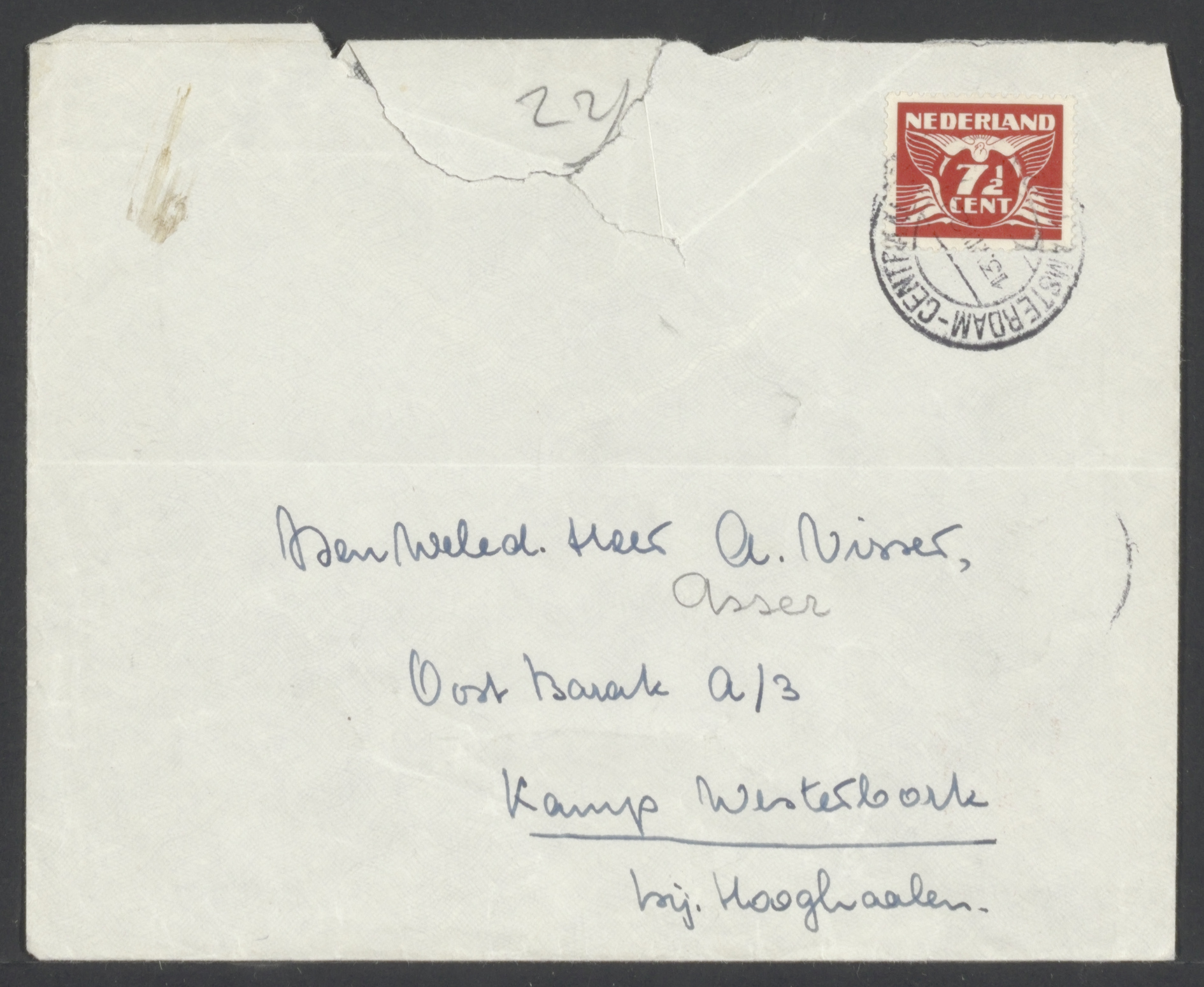 Enveloppe geadresseerd aan groot-verlofganger A.M. Hoogstraaten, Columbusstraat 56 's-Gravenhage