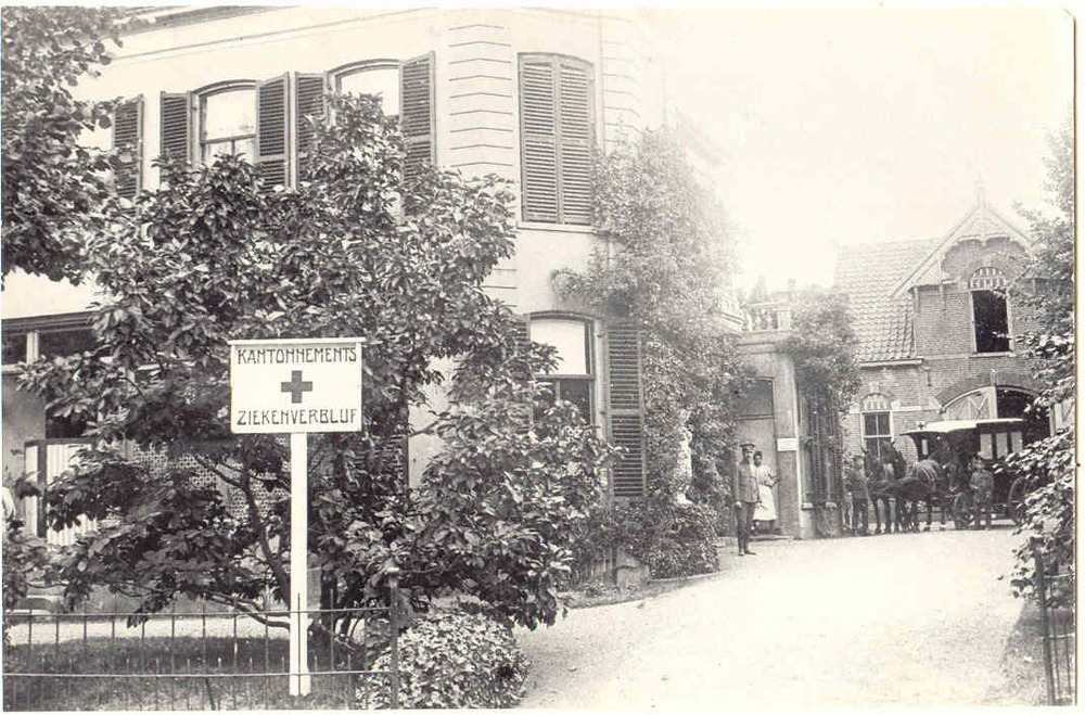 Villa 'Flora' aan het Maandereind, Dorp nummer 442 in Ede, naast de Openbare Lagere School (17-12-1986 gesloopt). Het huis is eigendom van de Graaf van Hogendorp, nazaat van Gijsbert Karel, die bekend is uit het 'driemanschap' van 1813. Op de foto staat de garnizoenscommandant, Jhr Leopold van Hogendorp met zijn oppasser. In de mobilisatiejaren 1914-1918 heeft de villa dienst gedaan als kantonnements ziekenverblijf. In deze villa woonde ook eens Ede's eerste Garnizoenscommandant, luitenant-kolonel Fredrik Hendrik Donner.