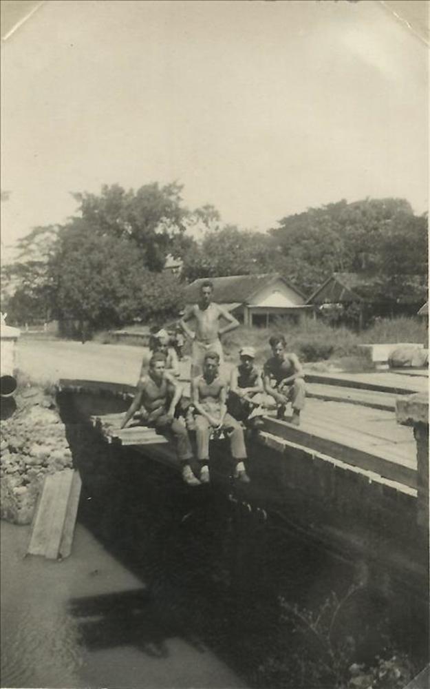 Indië na WO 2; groep pioniers, brug tekst onder foto: "Zie-Zo 't brugje is klaar".Album; Mijn Diensttijd in Indië. G.B.A. Ambrosis.periode 15-04-1947 - 15-05-1950.