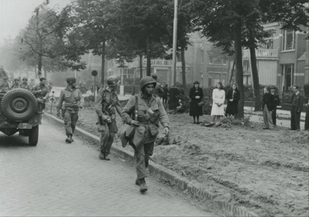 Foto van Amerikaanse parachutisten van het 504th Parachute Infantry Regiment op de Oranjesingel te Nijmegen bij hun terugkeer naar Nijmegen op 21 september 1944. Zij passeren het graf van Pvt Harold E. Peterman waar burgers bij staan.