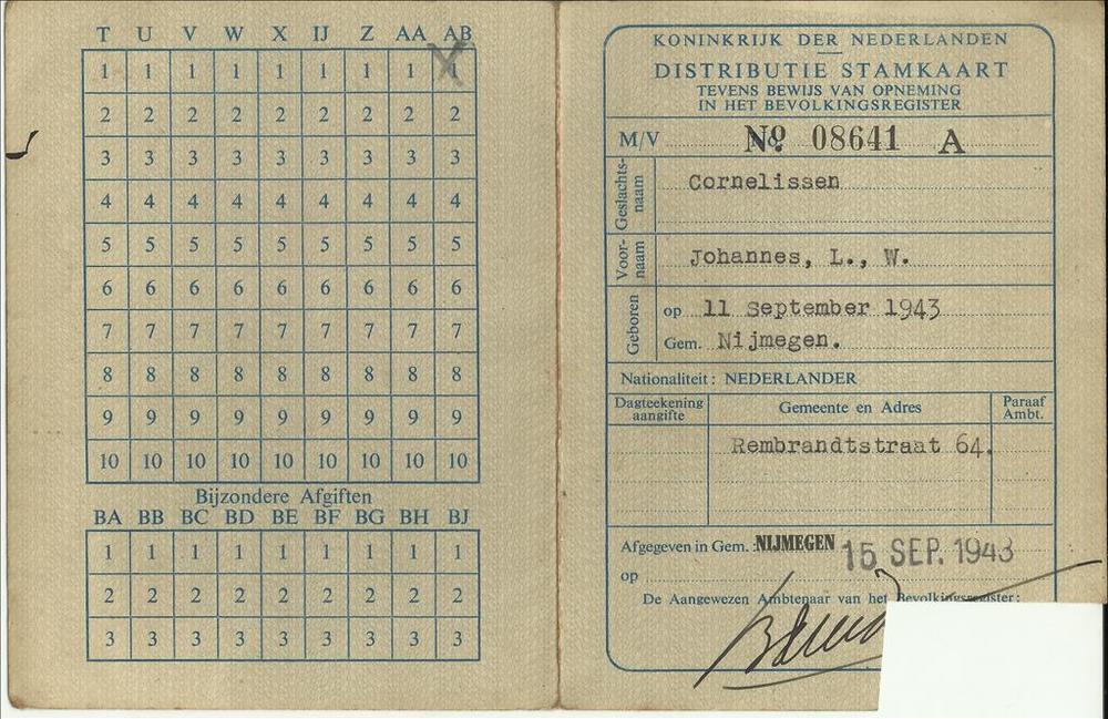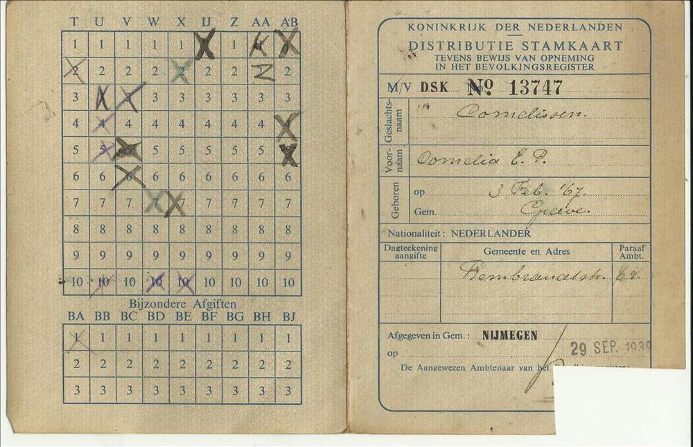 Distributiestamkaart Koninkrijk der Nederlanden ."Cornelissen Johannes geboren op 28 oktober '90" "Nijmegen 28 september 1939"